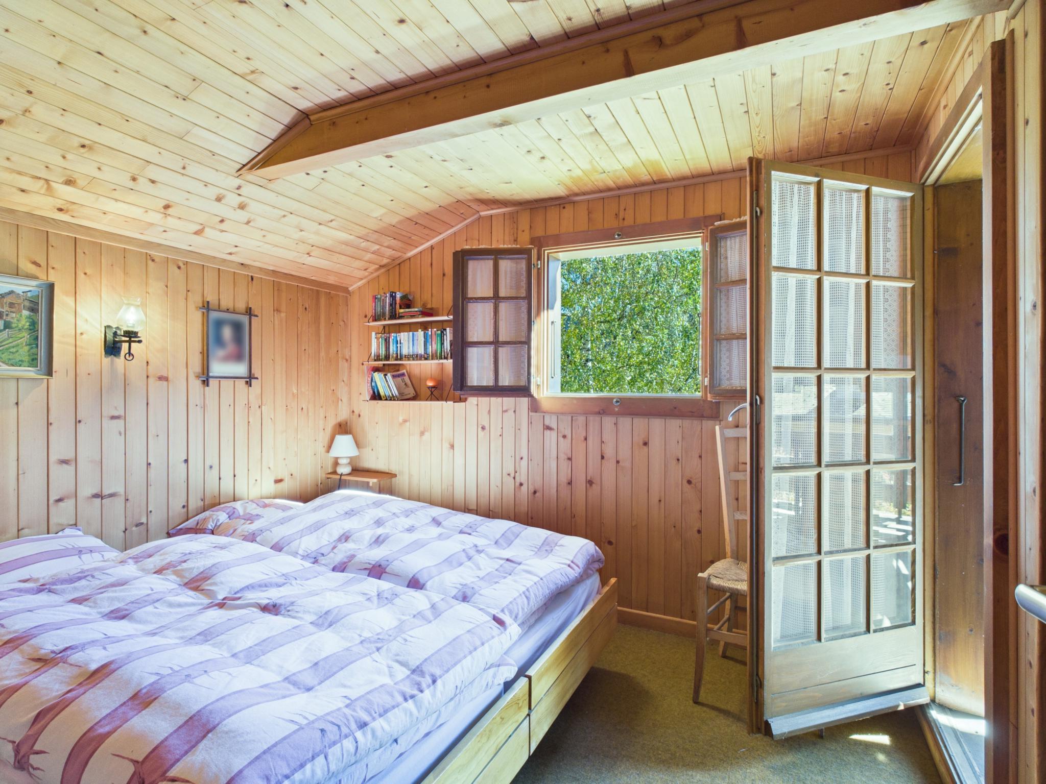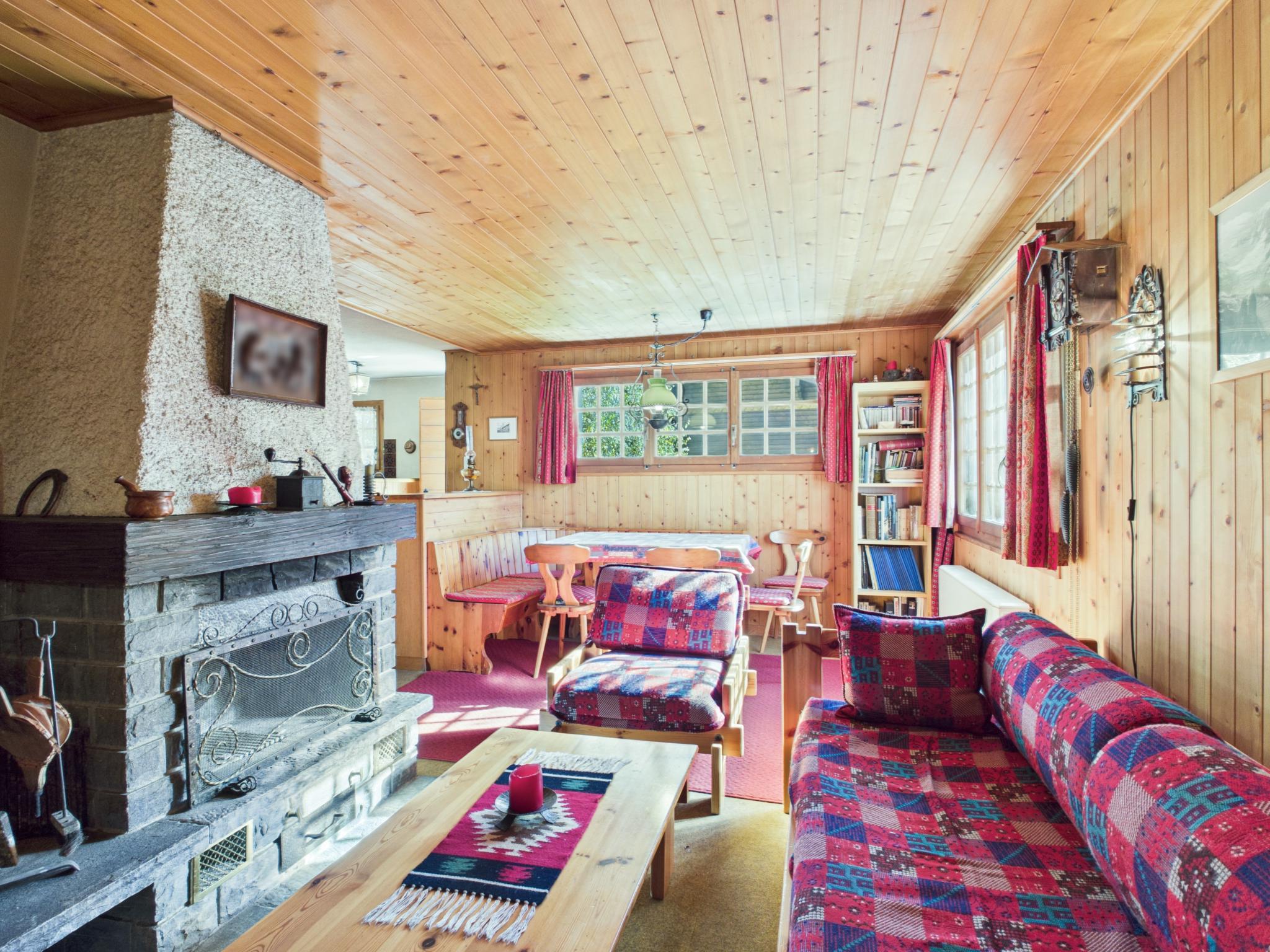Rez-de-chaussée, une terrasse couverte bien ensoleillée, entrée, cuisine ouverte avec bar, espace de vie avec salle à manger avec banc d’angle, salon avec cheminée centrale en pierre, un chauffage électrique à accumulation permet de maintenir le chalet hors gel durant la saison froide, un poêle à mazout sous l’escalier en bois menant à l’étage chauffe le rez-de-chaussée et le 1er étage, une salle d’eau/douche, un WC séparé et une pièce de service - local technique complètent le rez-de-chaussée.